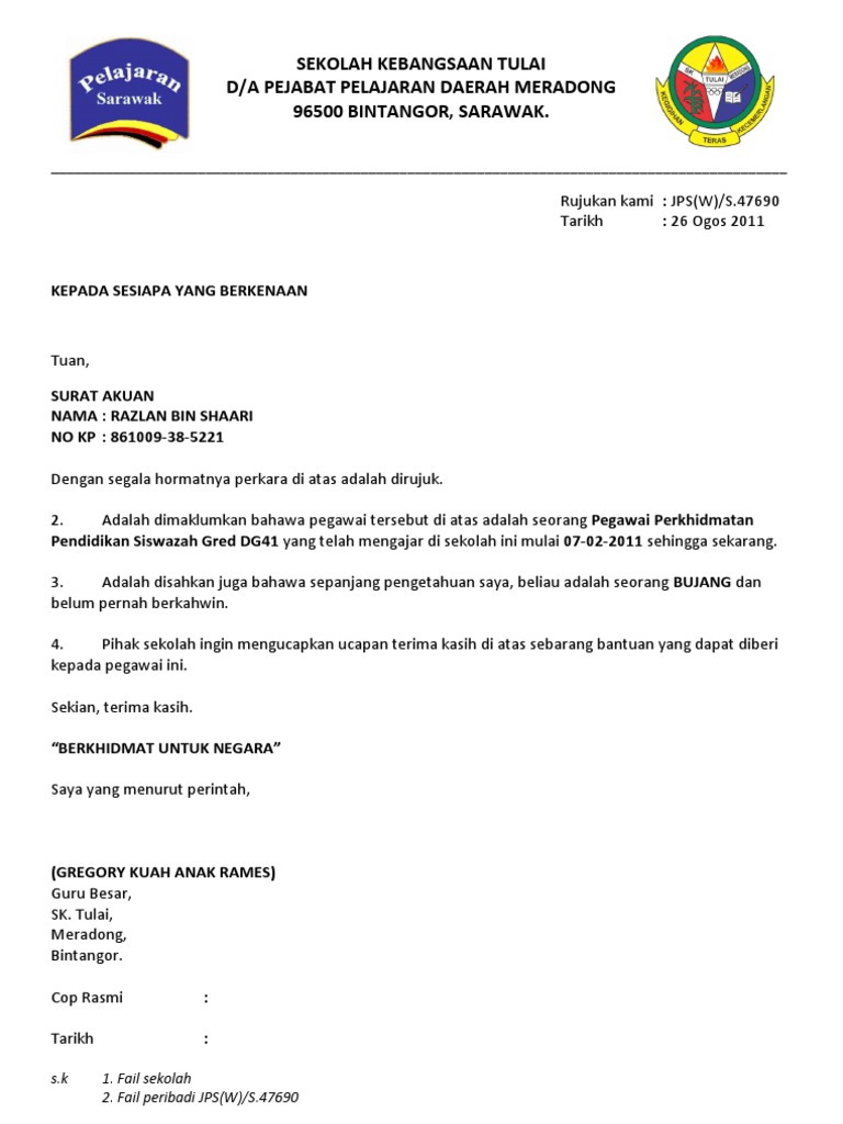 King fahd complex for printing the holy quran. Surat akuan pengesahan pendap atan. Keputusan semakan surat akuan bujang luar negara (surat kebenaran) dikeluarkan jpn putrajaya. Contoh surat akuan terima cek & sumbangan by rafizah abd rahman. Rating and stats 0up votes 0down votes 760 views. Diharapkan berada dalam perhatian pihak tuan. Semua dokumen di atas, jika berkaitan perlu diterjemahkan ke dalam bahasa malaysia atau bahasa inggeris oleh penterjemah bertauliah dan disertakan salinan asal bersama permohonan. Contoh format surat pengesahan majikan (2). Razlan bin shaari no kp : .persiaran perbandaran,40706 shah alam,selangor d.e.puan,per: .akuan bujang merujuk kepada perkara di atas, saya yang bertandatangan seperti di bawah ini mengesahkan bahawa firdaus bin khairudin no k/p: Surat akuan terima wang uploaded by ammil afiq. Surat akuan bujang ini hanya boleh di terima pakai sehingga selesai permohonan perkahwinan beliau.